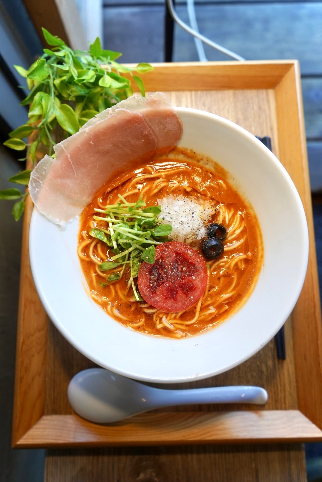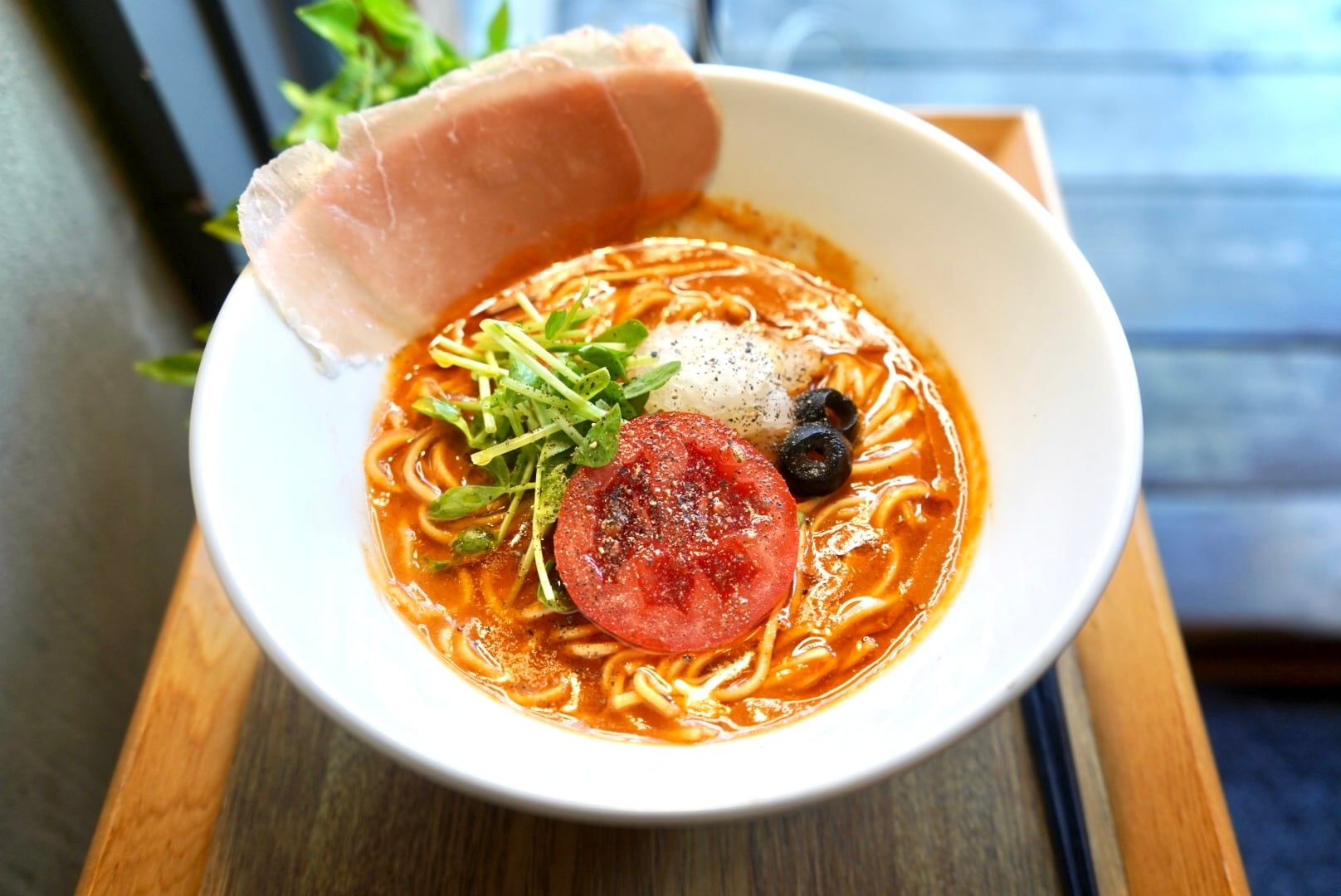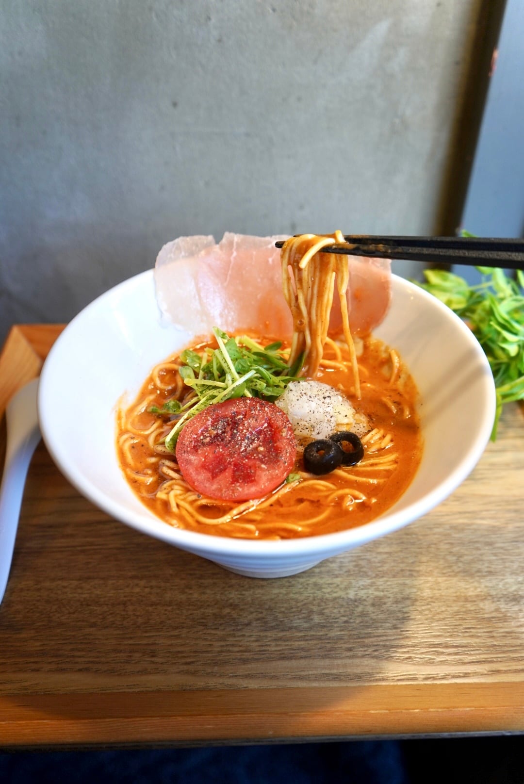 麺は特製の細麺で、濃密なトマトスープがしっかり絡むバランスに仕上げています。